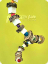 Auf Edelstahldraht aufgefädelte Kork und Weichholzstücke sowie bunte Holzkugeln  - die Spirale ist flexibel und federt.